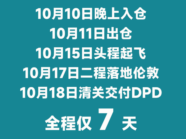 10月10日晚间入库 → 10月11日出仓 → 10月15日头程起飞 → 10月17日二程落地伦敦 → 10月18日清关交付DPD