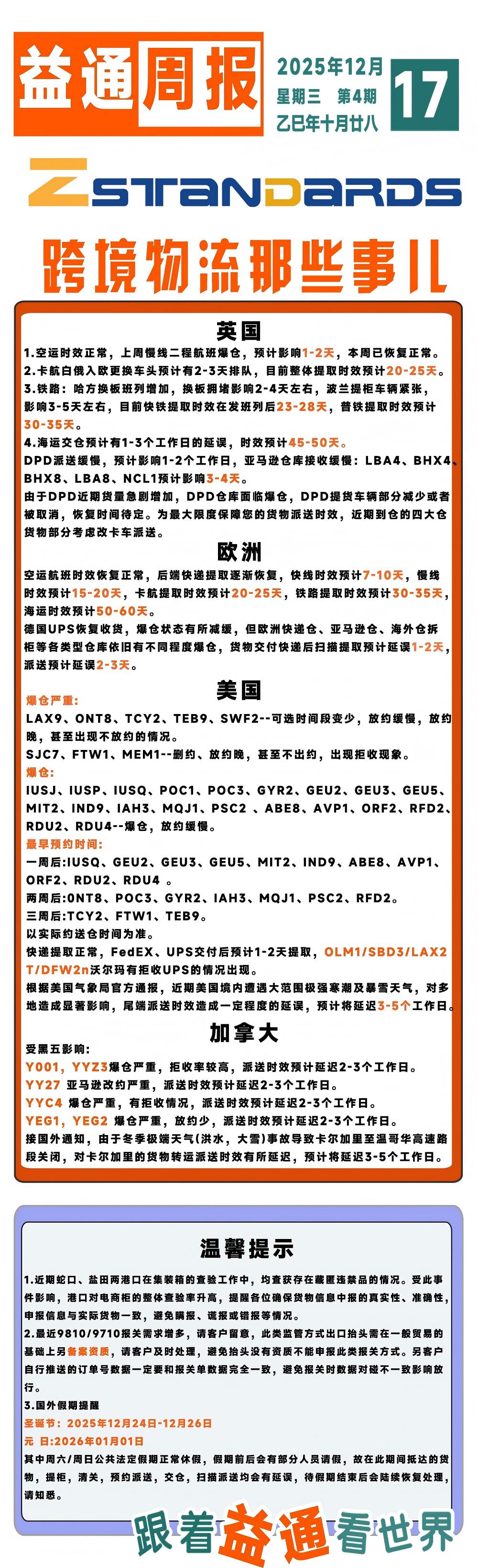 3.国外假期提醒圣诞节:2025年12月24日-12月26日元 日:2026年01月01日其中周六/周日公共法定假期正常休假,假期前后会有部分人员请假,故在此期间抵达的货物,提柜,清关,预约派送,交仓,扫描派送均会有延误,待假期结束后会陆续恢复处理,请知悉。