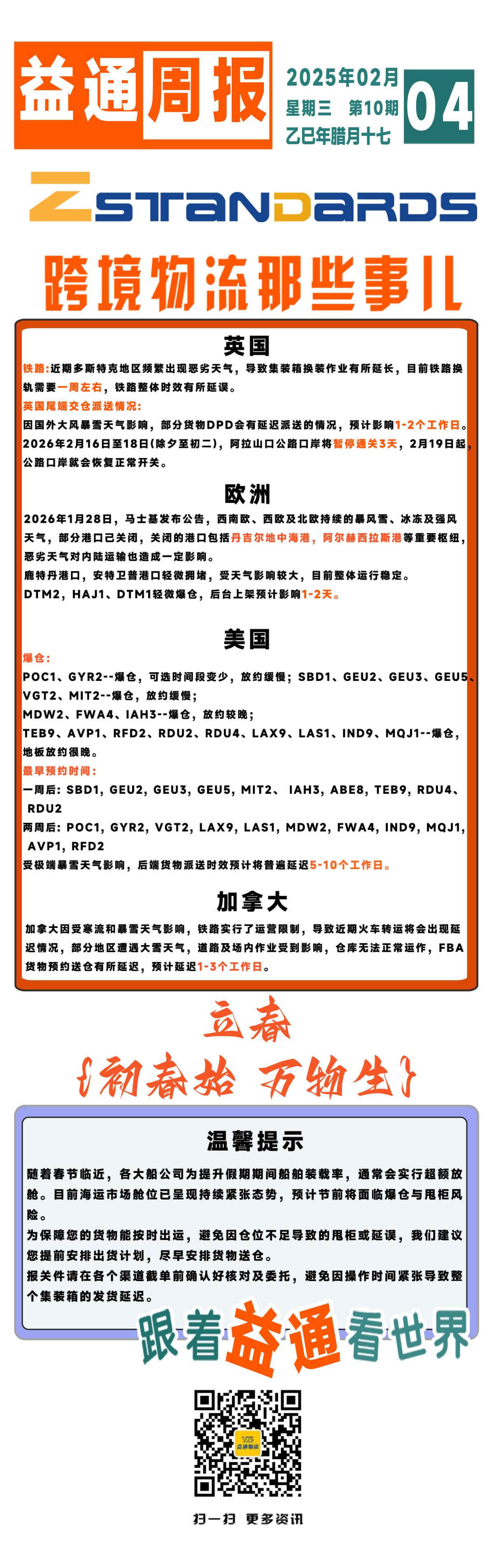 因国外大风暴雪天气影响,部分货物DPD会有延迟派送的情况,预计影响1-2个工作日。2026年2月16日至18日(除夕至初二),阿拉山口公路口岸将暂停通关3天,2月19日起,公路口岸就会恢复正常开关。
