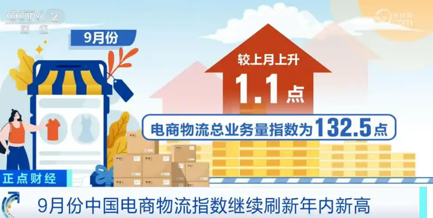 央视网消息:中国物流与采购联合会16日公布9月份中国电商物流指数。中国电商物流指数环比继续上升,继续刷新年内新高。